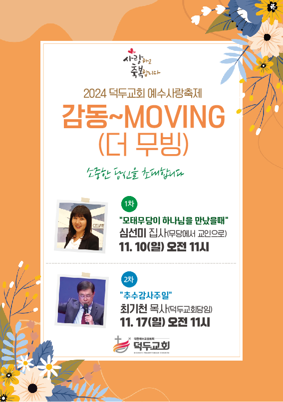 교회소식 2024 덕두교회 예수사랑축제 "감동~MOVING(더 무빙)" 페이지 정보 작성자 관리자 작성일 24-10-19 22:06 조회 353회 본문 이전글2025년 설날가정예배지 다음글2024 덕두교회 여름사역 안내 목록